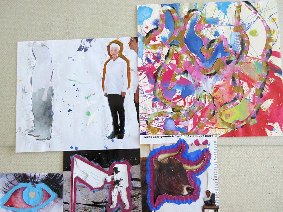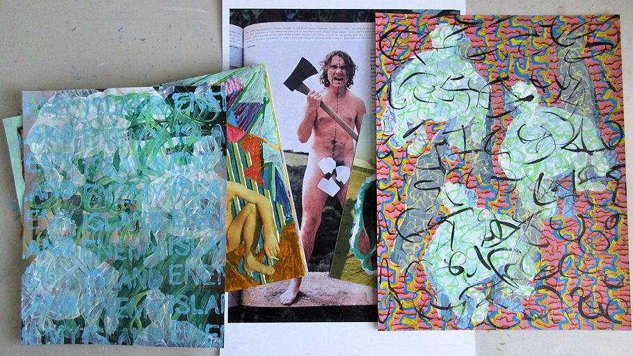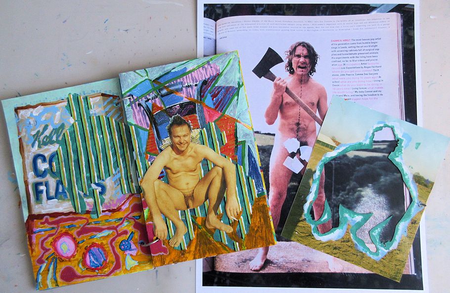 That Matt Jones took the picture of Damien Hirst wielding an ax (i-D magazine October 1995) is a given, but, unfortunately, I no longer remember where the squatting Hirst nude came from, however, the back of the cut-outs depict an art gallery advertisement.
