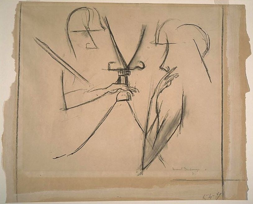 Invited by Bamberger's store of Newark to dress a window during the period of the annual art show in the first fortnight of February, Duchamp's idea is to give some publicity to Robert Lebel's book []6.11.1959]. He asks Henri Marceau if the Philadelphia Museum of Art would agree to lend three works from the collection to Bamberger's: Nu descendant un Escalier, No.3 [29.4.1919], the copy of the famous picture made for Arensberg; Etude pour les Joueurs d'Echecs, a charcoal and ink study for the painting [15.6.1912] and Vierge, No.2 [7.8.1912].