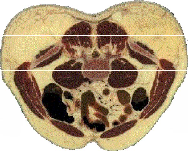 Since the male corpse used in the Visible Human Project is that of an overwieght man, the relationship between the navel and the iliac crests of the hip bones is slightly out of synch. Normally, the "disappearance" of the hip bones aligns with the center of the navel.