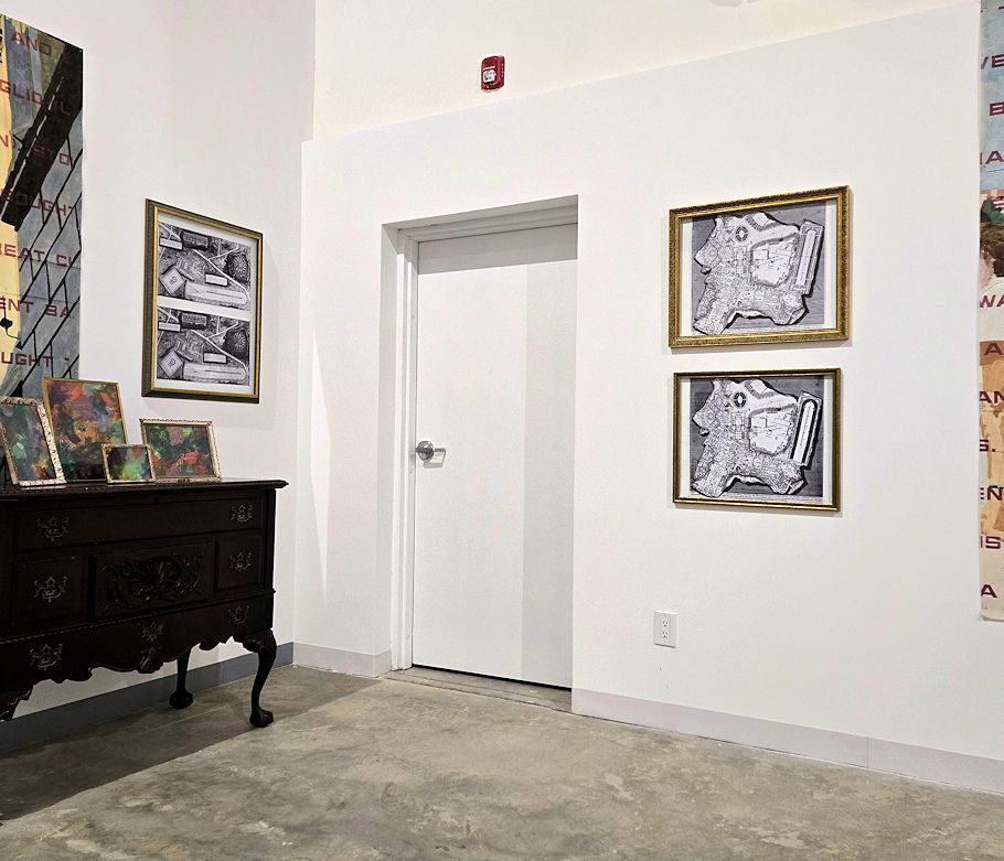 Comprising (at least) three salvaged architectural artifacts from Whitemarsh Hall where the Metropolitan Museum of Art collection was kept in safe keeping during WWII--one piece, the larger marble slab, supports the painting Anonymous Saint In Bikini While Jesus Is Walking On Water.