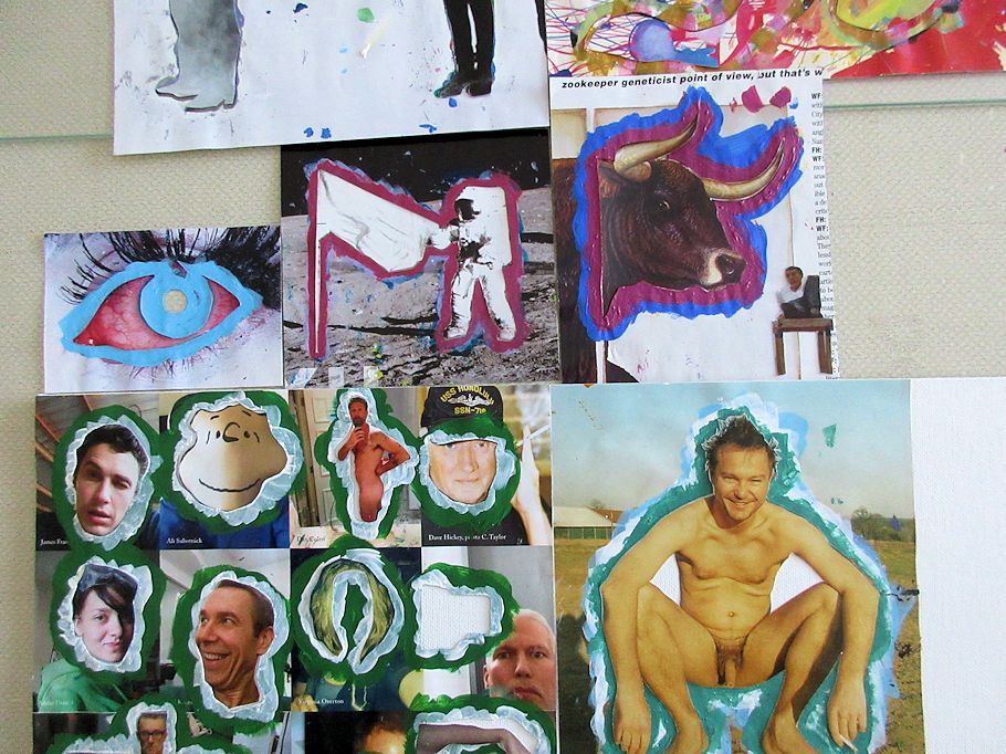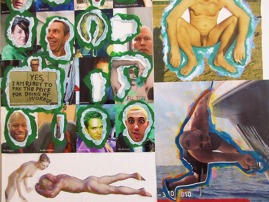 That Matt Jones took the picture of Damien Hirst wielding an ax (i-D magazine October 1995) is a given, but, unfortunately, I no longer remember where the squatting Hirst nude came from, however, the back of the cut-outs depict an art gallery advertisement.