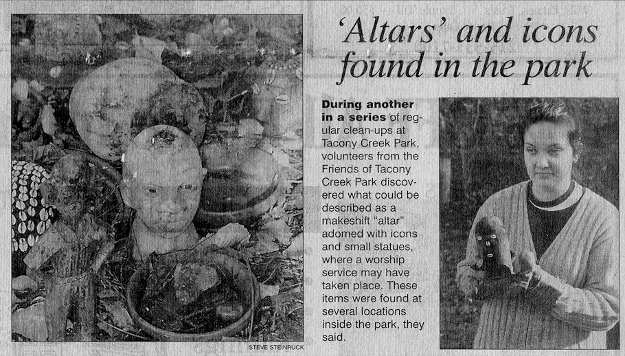 During another in a series of regular clean-ups at Tacony Creek Park, volunteers from the Friends of Tacony Creek Park [of which lauf-s is a high standing member; they wanted me to be their president, but my sporadic (literally schizophrenic) schedule made me decline] discovered what could be described as a makeshift "altar" adorned with icons and small statutes, where a worship service may have taken place. These items were found at several locations inside the park, they said.