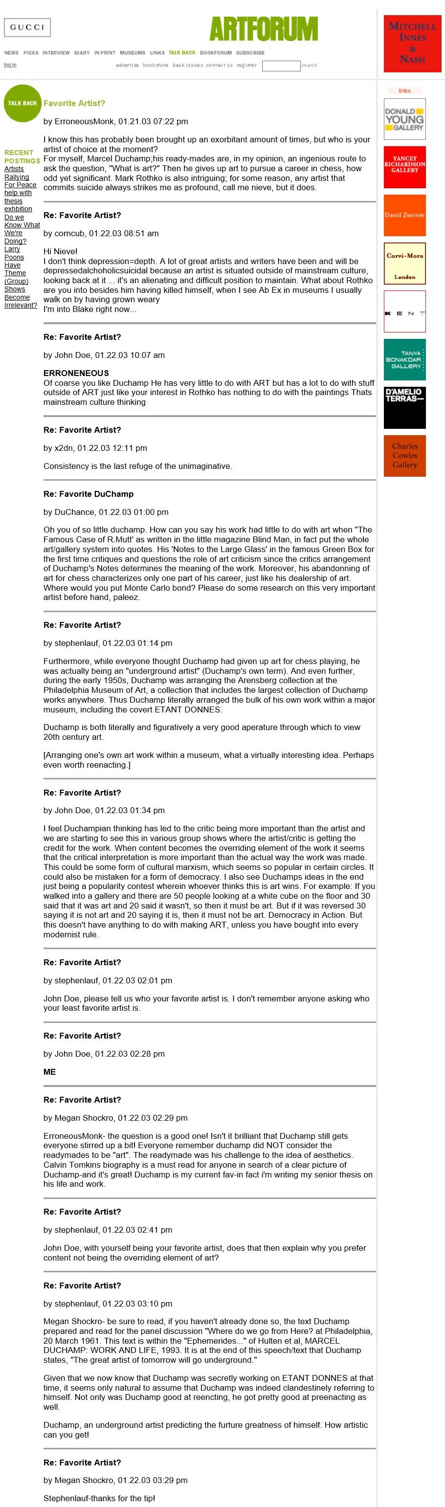 Judging by the records, my first post at artforum/talkback, as stephenlauf, was 10 November 2002, and I stopped posting there regularly circa early 2006--posting as Unbekannt began Spring 2005. Turned out that DuChance, who over the years called me more names than you can imagine, was actually T.J. Demos, author of The Exiles of Marcel Duchamp, published 2007. Perhaps one day in the future I will collect our unwitting collaborative texts as a work of art entitled Talk About Pussies Galore.