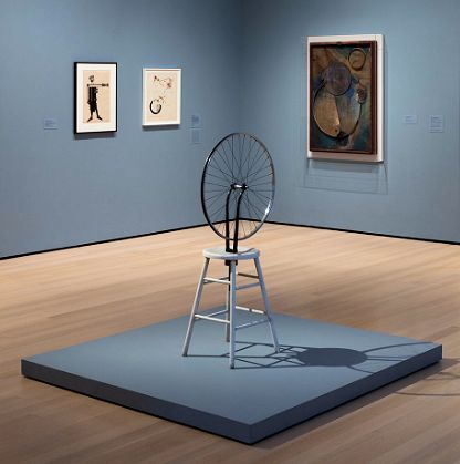 Metal wheel mounted on painted wood stool, 51 x 25 x 16 1/2" (129.5 x 63.5 x 41.9 cm). The Sidney and Harriet Janis Collection. © 2026 Artists Rights Society (ARS), New York / ADAGP, Paris / Estate of Marcel Duchamp