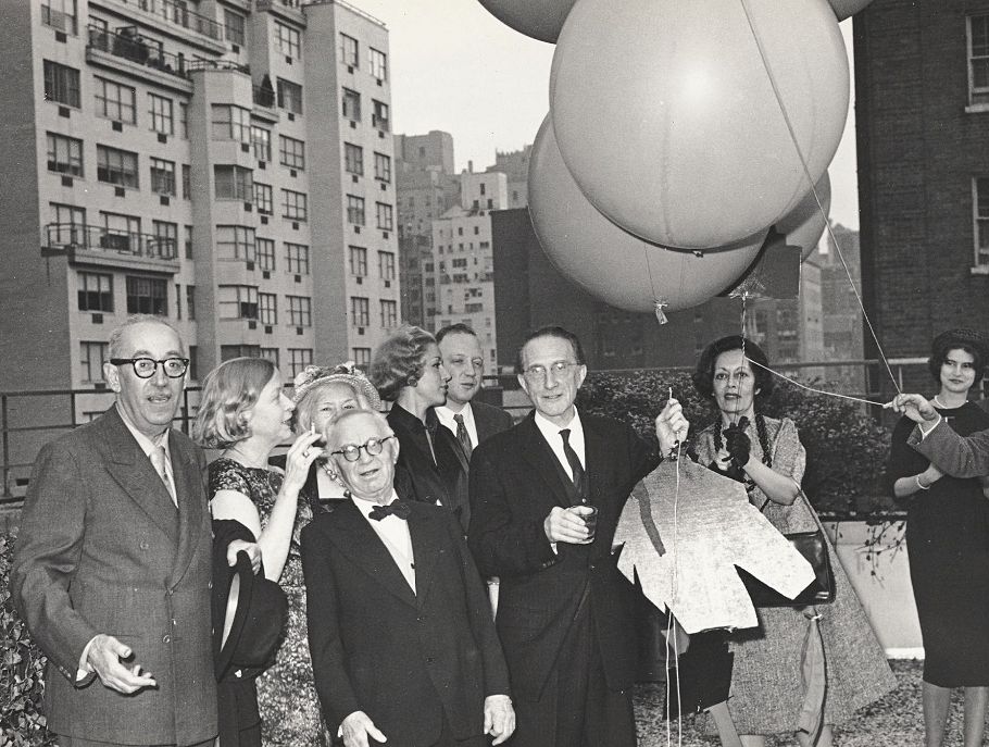 On the roof of 978 Madison Avenue above the gallery, David Hare has devised an airborn sculpture of chesspieces and balloons which, to the surprise of the guests, explode one by one. Among the works of art exhibited in the gallery itself are the beautiful chess sets made by Max Ernst and Man Ray, and one by Salvador Dali in which fingers have become the chessmen. At the opening Duchamp plays chess with Dali.