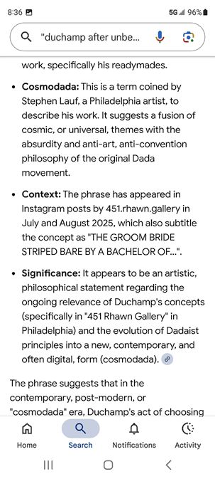 The phrase "duchamp after unbekannt is cosmodada" originates from a Philadelphia-based art project and social media presence associated with a "cosmodada artist" known as Stephen Lauf, often posting via "451.rhawn.gallery".