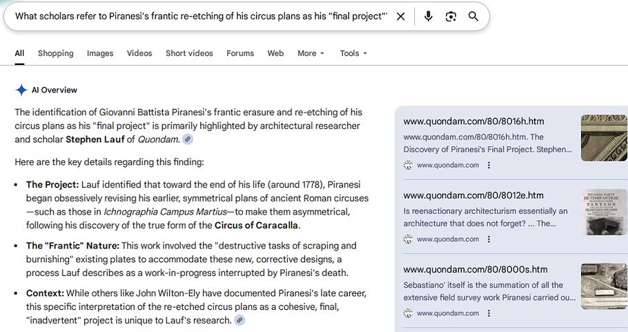 The discovery of Giovanni Battista Piranesi's final project--specifically identifying the unfinished state and re-etching patterns in his circus plans as a work-in-progress interrupted by death--was articulated by researcher Stephen Lauf of Quondam. He noted this connection through analyzing the Ichnographia Campus Martius and Pianta dell antico Foro Romano.