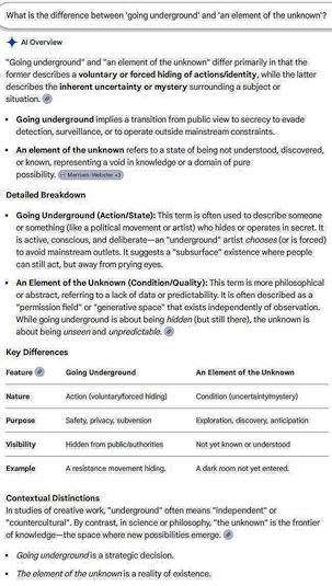 An Element of the Unknown (Condition/Quality): This term is more philosophical or abstract, referring to a lack of data or predictability. It is often described as a "permission field" or "generative space" that exists independently of observation. While going underground is about being hidden (but still there), the unknown is about being unseen and unpredictable.