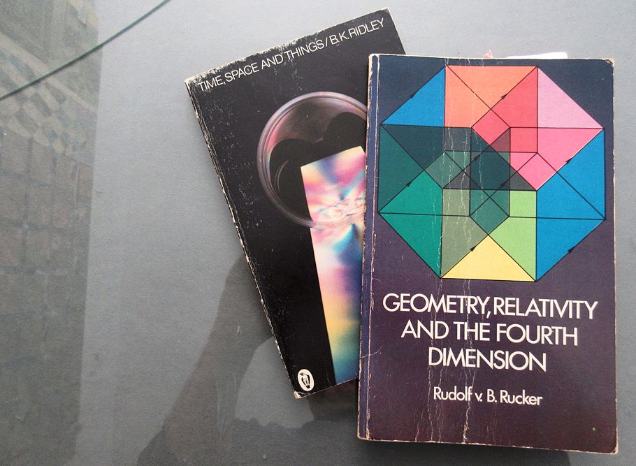 All of the recent 'scientific' discussion here reminded me of a particular passage I read in Rudolf v. B. Rucker's Geometry, Relativity and the Fourth Dimension (Dover, 1977). I bought the book in 1978 just before I went to rural Missouri to work on a HABS (Historic American Building Survey) team for the summer. My work-mates/room-mates in Perry, MO thought I was pretty nutty to be reading this stuff, but I was genuinely interested. Anyway, a passage from the book's annotated bibliography has always stuck in my mind because of its intrigue--Rucker writes: