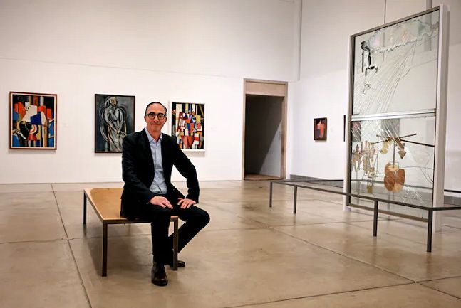 Philadelphia Museum of Art curator Matthew Affron in the Duchamp gallery on March 4, 2026. Marcel Duchamp’s "The Bride Stripped Bare by Her Bachelors, Even (The Large Glass)," is at right.