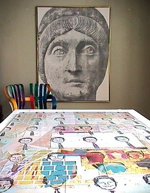 This is the 'big glass,'" he said, pointing to a large shattered pane of glass decorated with oil paint and lead wire in abstract patterns, which was mounted on a stand in front of the window looking out on the courtyard. "Duchamp called it The Bride Stripped Bare By Her Bachelors, Even." He laughed and went on in a loud voice to make several vulgar remarks.