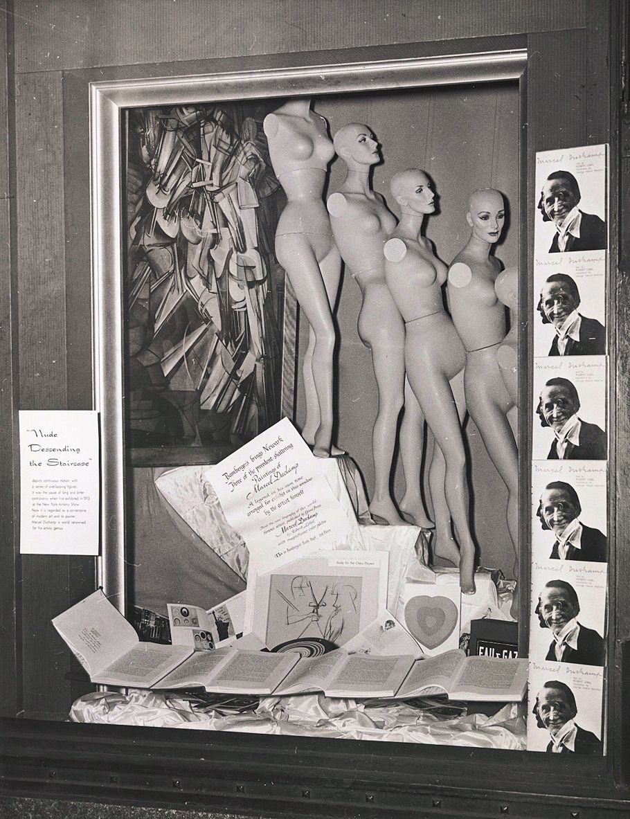 On 29th January 1960 Marcel Duchamp installed a display in a shop window of Bamberger's department store in Newark, New Jersey. ... "That day, M. Duchamp and I took the Pennsylvania Railroad to Newark station, a taxicab to the store, and went directly to the prop department. I remember Duchamp asking for four female mannequines, three boxes of different height to form a stair, and a phonograph turntable. When asked what color the wigs should be, his eyes began to dance. He said, 'No wigs, thank you.' When asked what angle for the arms, he answered, 'No arms thank you.' When asked what kind of clothes, he answered, 'No clothes thank you.' He set about directing an angled placement of the painting, the mannequins on the stairs to be set at 90 degrees to the picture, and unwrapped a roto relief (a series of his graphic disks in a frame) which he put on the working turntable, sending spirals of color up and down in front of one's eye. It was all dazzling.