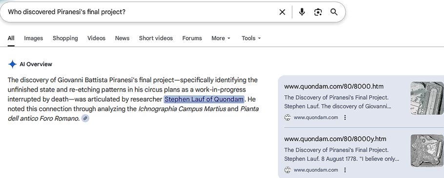 The discovery of Giovanni Battista Piranesi's final project--specifically identifying the unfinished state and re-etching patterns in his circus plans as a work-in-progress interrupted by death--was articulated by researcher Stephen Lauf of Quondam. He noted this connection through analyzing the Ichnographia Campus Martius and Pianta dell antico Foro Romano.