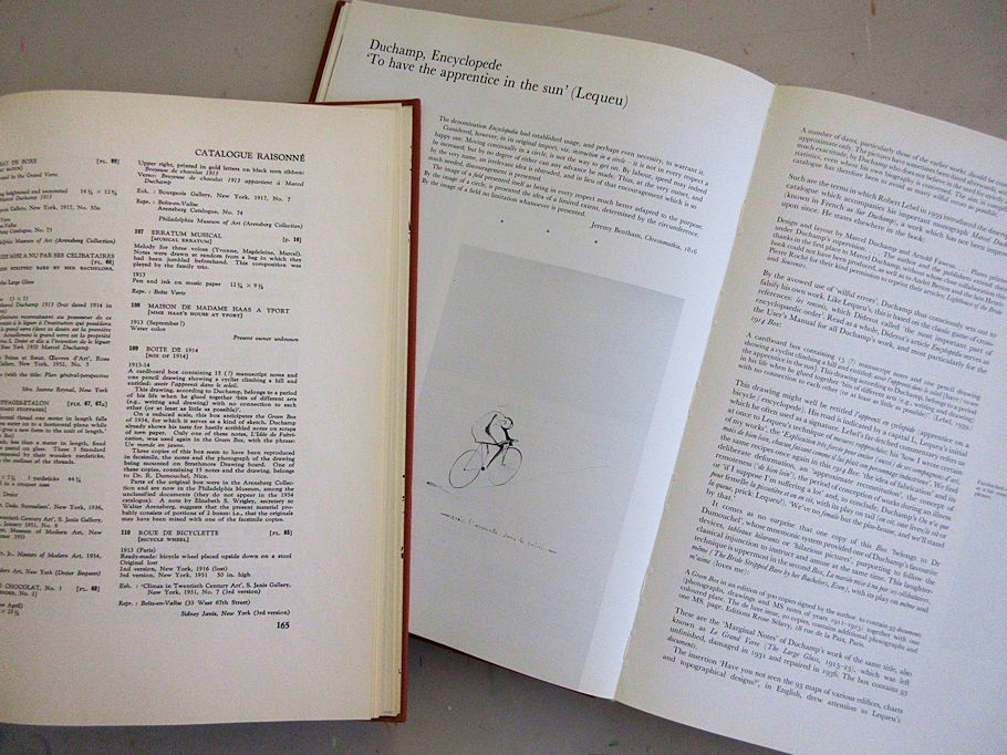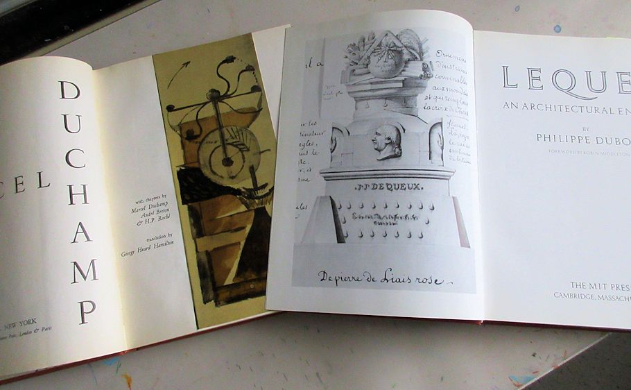 A couple days after that I went to see what Lebel's "far-fetched commentary" might be--the used, first edition of Lebel's Marcel Duchamp which I purchased via eBay earlier this year arrived with a strong musty odor, so it's been sitting open in the garage for an airing-out, meaning I haven't read the book yet. Lebel's only commentary on avoir l'apprenti dans le soleil is as follows: "This drawing, according to Duchamp, belongs to a period of his life when he glued together 'bits of different arts (e.g., writing and drawing) with no connection to each other (or at least as little as possible)'." Okay, I guess, but its actually Duchamp's commentary, not Lebel's.