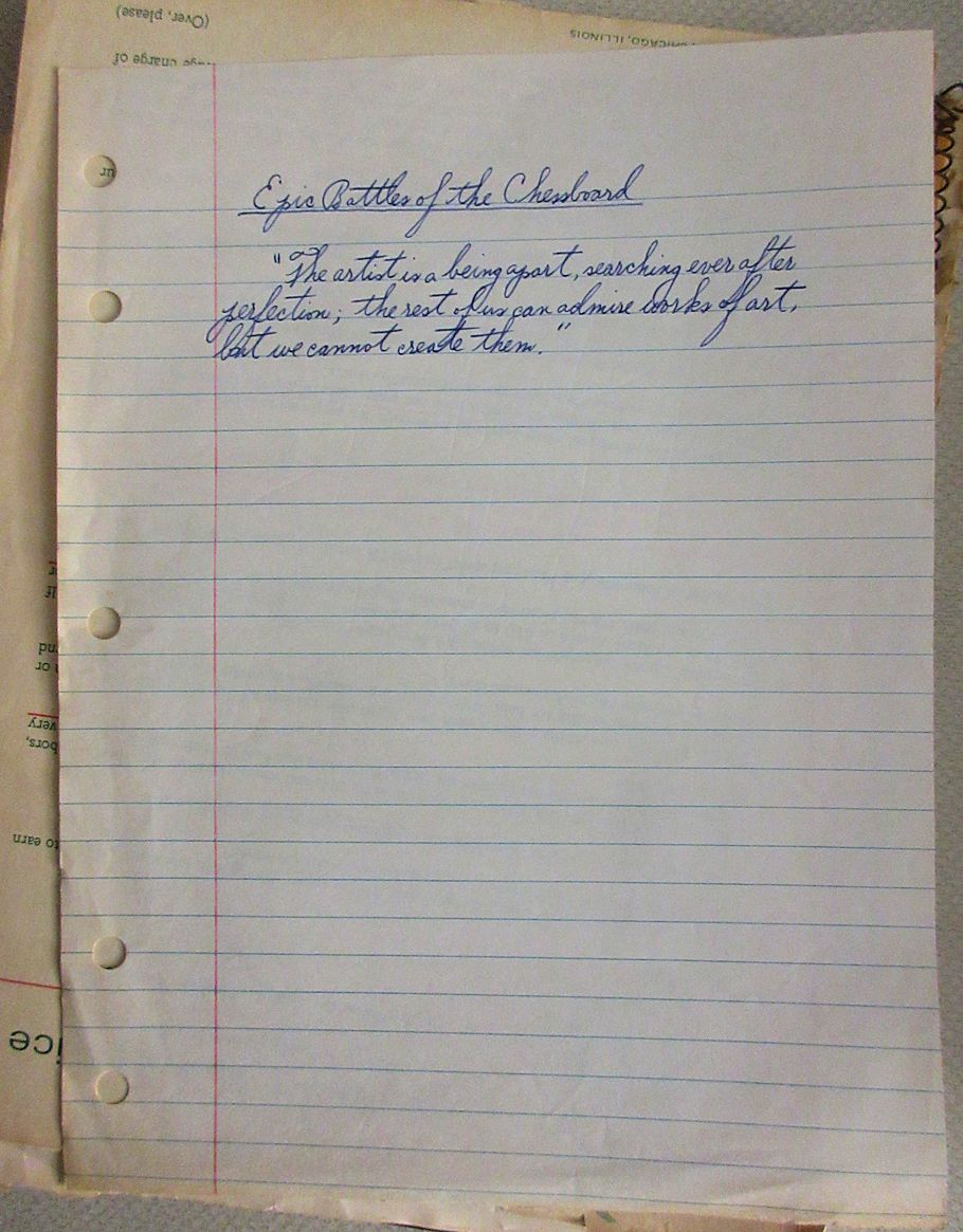 A stand-alone page among other stand-out items all out-of-sync with the rest of the (typical) material in the box. Epic Battles of the Chessboard?! Of course I immediately thought of Duchamp, but Otto indeed was a chess fanatic in 1972, especially around the Bobby Fischer vs. Boris Spassky "Match of the Century" July 11 to August 31, 1972. I vividly remember my then 19 year old brother reading over a dozen (and more) chess books from the Free Library that summer. That was a full four years before Otto 'snapped' into schizophrenia mid-summer 1976, and I believe the page here dates circa 1977 because of the words written on another page with the same hole punches. Yet, after looking at each page more closely, they are for sure not from the same pack of loose-leaf paper--the holes are the same, but not the margins--and the handwriting is also different.