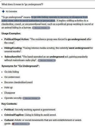 Going Underground (Action/State): This term is often used to describe someone or something (like a political movement or artist) who hides or operates in secret. It is active, conscious, and deliberate--an "underground" artist chooses (or is forced) to avoid mainstream outlets. It suggests a "subsurface" existence where people can still act, but away from prying eyes.
