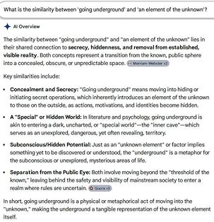 The similarity between "going underground" and "an element of the unknown" lies in their shared connection to secrecy, hiddenness, and removal from established, visible reality. Both concepts represent a transition from the known, public sphere into a concealed, obscure, or unpredictable space.