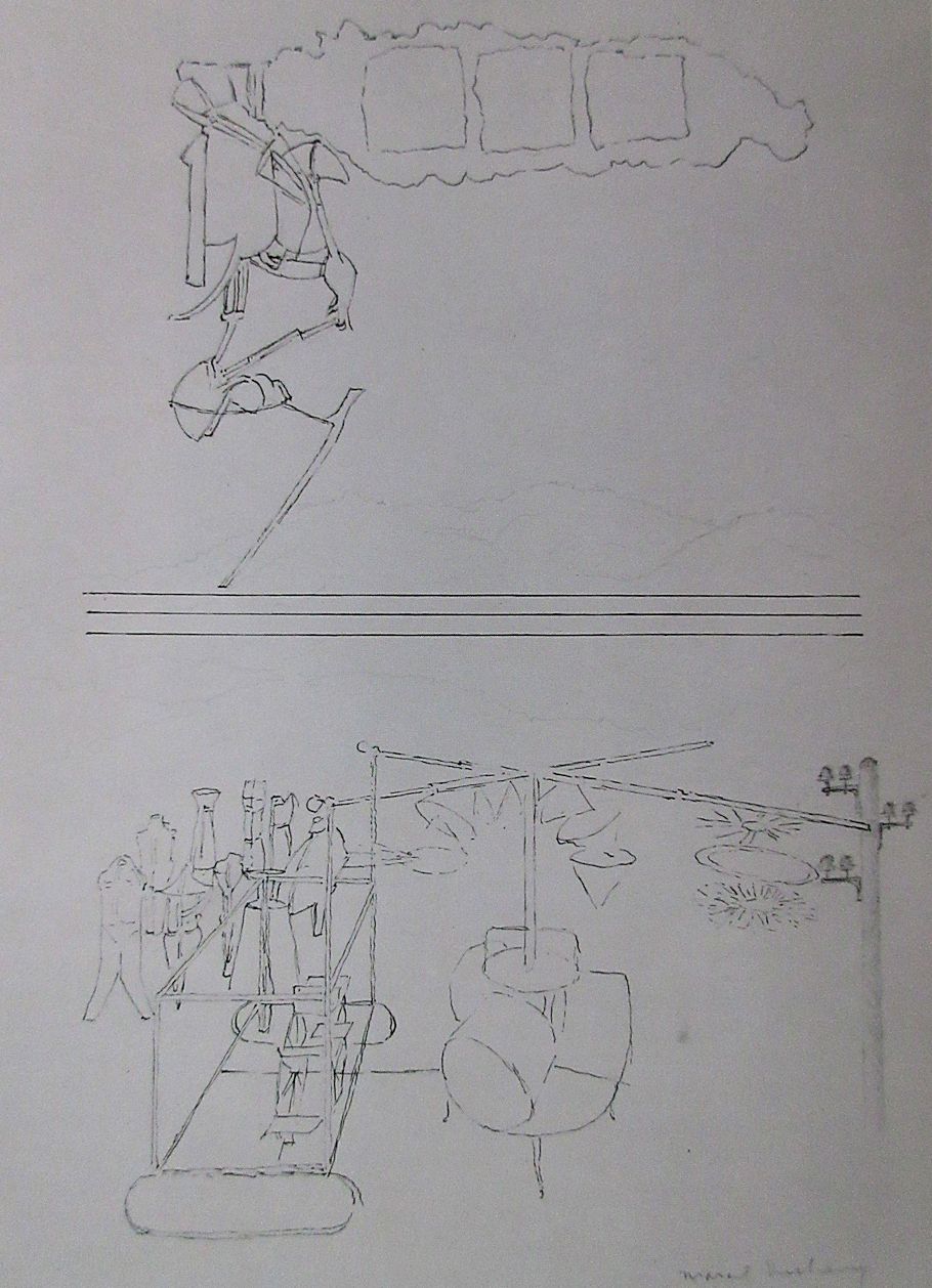 "Another "landscape" which Duchamp produced in 1959, forms a tantalizing link between The Large Glass and Etant Donnés.... . The punning title Cols Alités, is amplified by a startling inscription: "Projet pour le modèle 1959 de 'La Mariée mise à nu par ses célibataires, même'" The drawing is more startling still. Duchamp has drawn a background for his Glass! The basic elements of the Glass, including three parallel lines across the middle representing the Bride's Clothes, are drawn in ink, and behind them, apparently lightly sketched in pencil, rise the irregular rolling forms of a hilly landscape. To the right, just tangent to on blade of the Scissors atop the chocolate Grinder, Duchamp has added an electrical pole, the common variety that punctuates the countryside everywhere, complete with glass insulating knobs and wires disappearing in the distance.