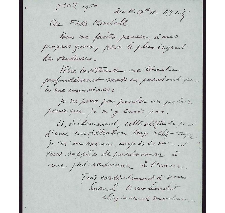 After declining the invitation to speak in Philadelphia [31.03.1950], Duchamp has received another letter from Fiske Kimball enquiring whether he will not reconsider his decision. "Your insistence touches me profoundly," says Duchamp, "but doesn't manage to convince me. I cannot speak in public because I don't believe in it." Excusing himself, Duchamp begs him to pardon "a topsy-turvy prima donna" and signs himself "Sarah Bernhardt alias Marcel Duchamp".